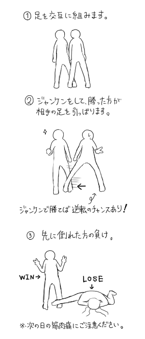ジャンケンで負けた人が少しずつ足を開いていって、倒れたほうの負けというゲーム。